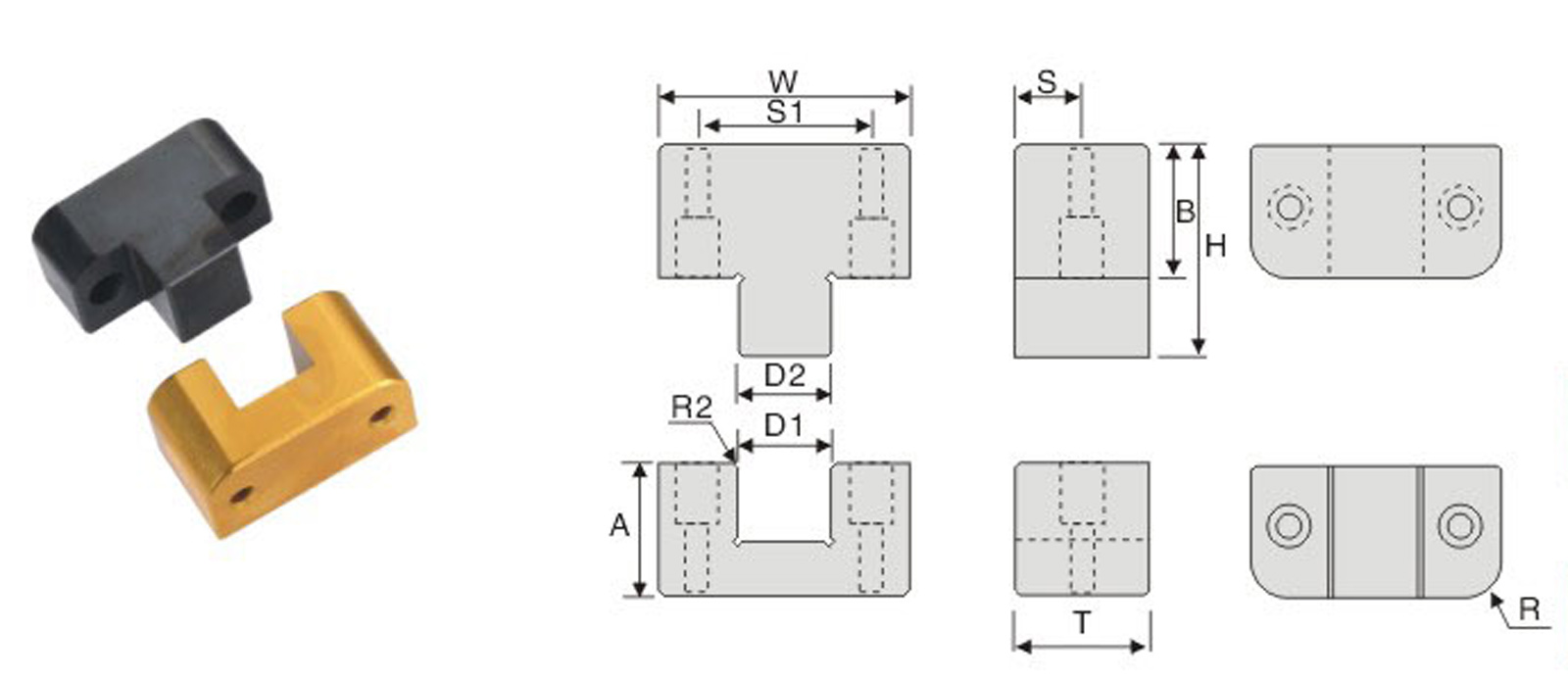 | Type | W 0 -0.005 | T 0 -0.002 | A 0 -0.002 | B 0 -0.002 | C | OVERALL HEIGHT | D1 0.0002 0 | D2 0.0002 0 | H | R RADIUS | R2 | S ±0.010 | S1 ±0.010 | SHCS | |