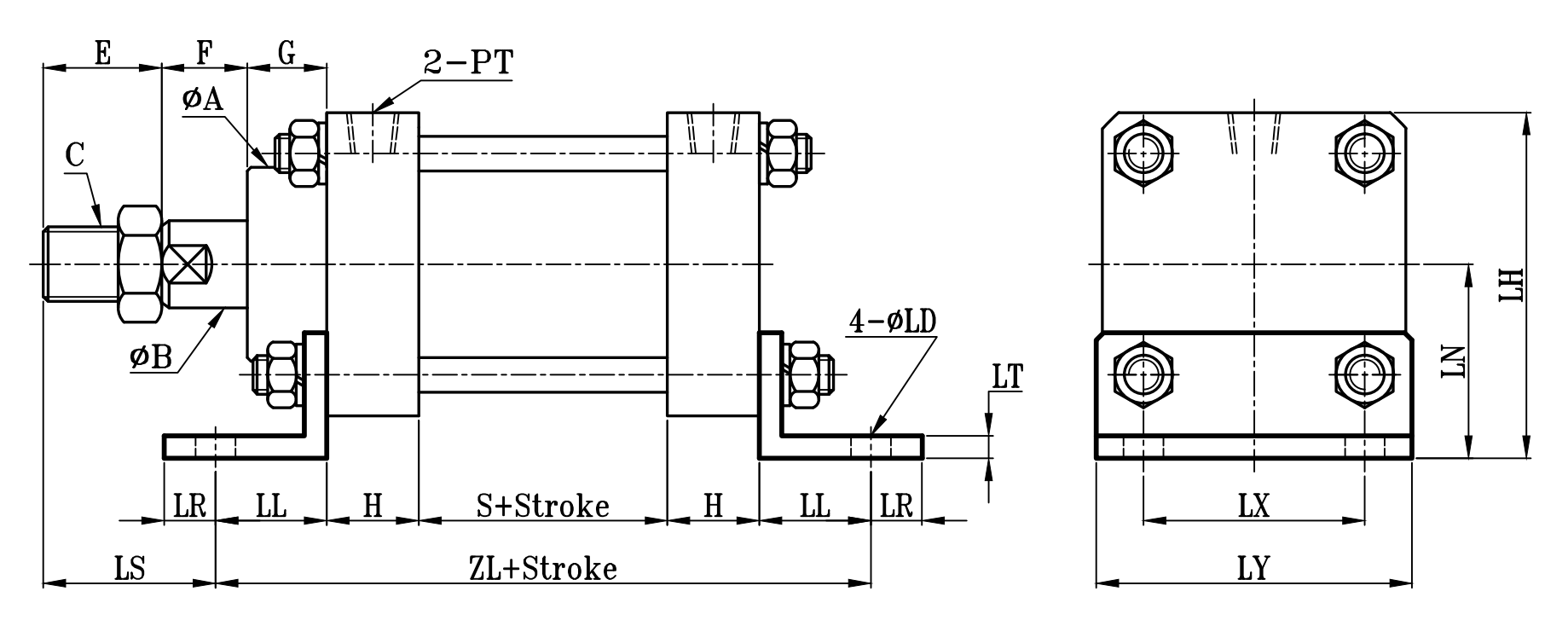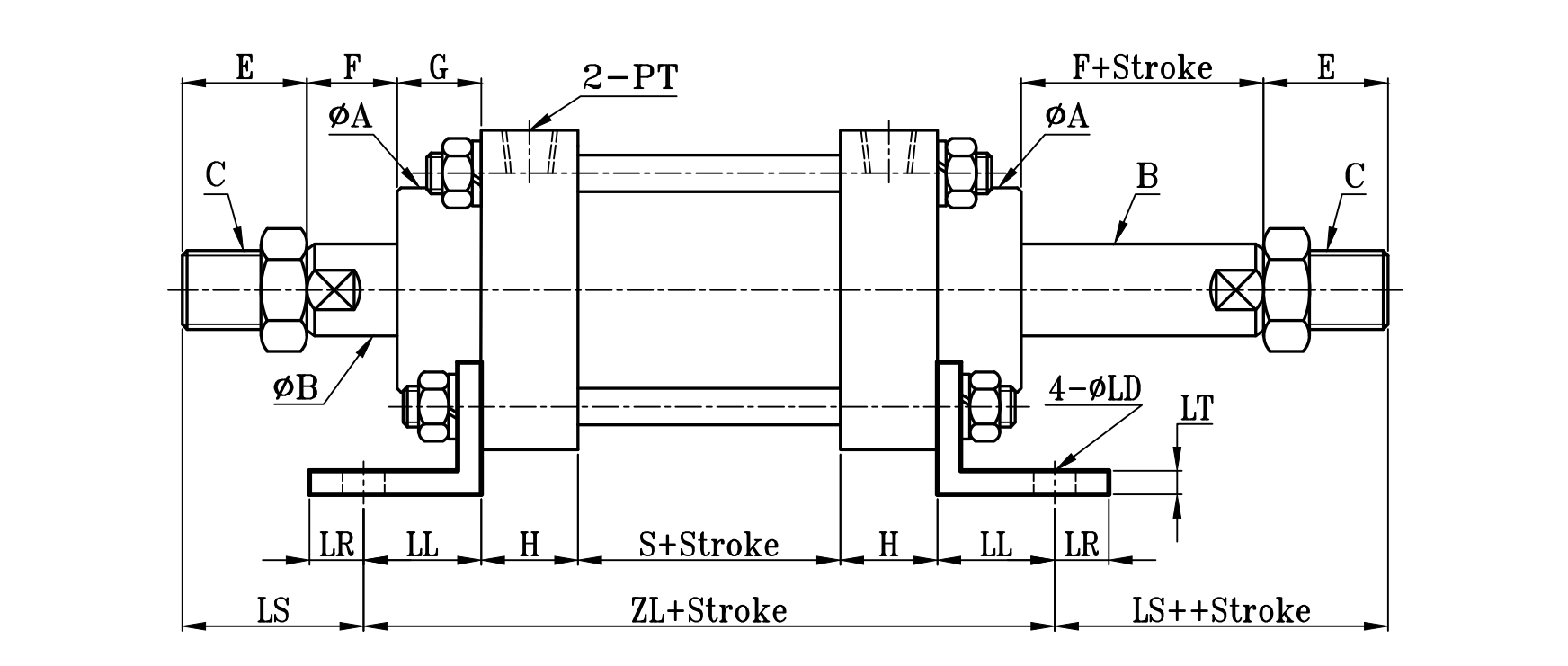 | 缸徑 BORE | ΦA(chǔ) | ΦB | C | E | F | G | H | PT | S | LS | ZL | ΦLD | LH | LN | LL | LR | LT | LX | LY |