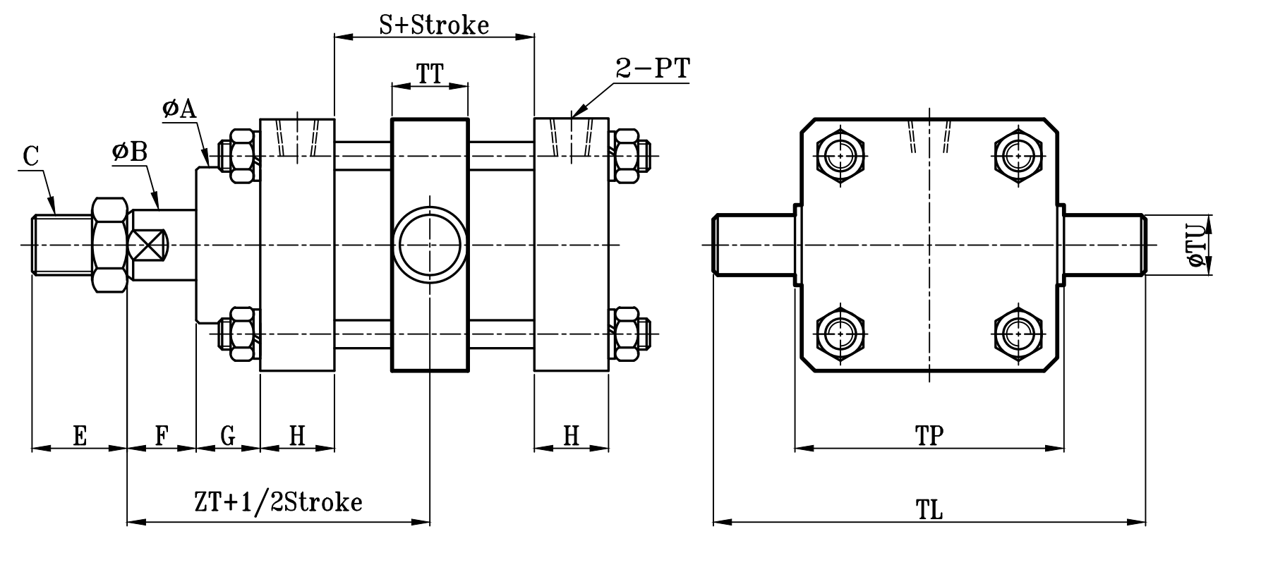 | 缸徑 BORE | ΦA | ΦB | C | E | F | G | H | PT | S | ZD | ZT | TL | TP | TT | ΦTU |