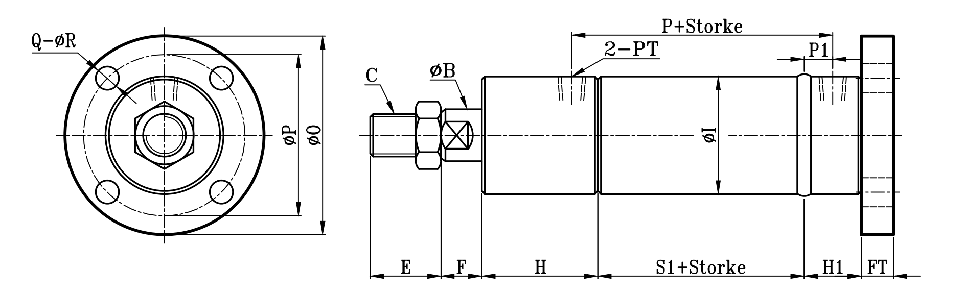 | 缸徑 BORE | ΦB | C | E | F | HI | H | ΦI | P | P1 | PT | S1 | S | ZB | ZD | FT | ΦFD | FR | FX | FY | FZ | Q | ΦR | Φ0 | ΦP |