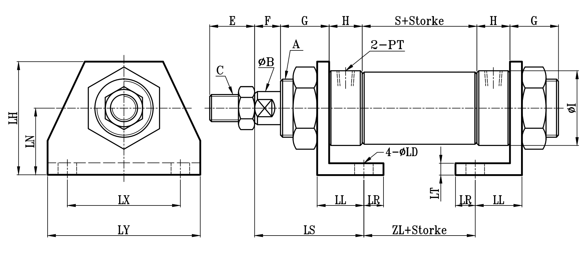 | 缸徑 BORE | A | ΦB | C | E | F | G | H | ΦI | PT | S | LS | ZL | ΦLD | LH | LN | LL | LR | LT | LX | LY |